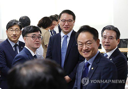 (서울=연합뉴스) 김주형 기자 = 대통령실 김용범 정책실장(오른쪽)과 더불어민주당 허영 원내정책수석부대표(오른쪽 두번째) 등이 18일 서울 여의도 국회 의원회관에서 대통령실과 정부, 여당 등이 함께하는 추경안 관련 비공개 회의에 참석해 대화하고 있다. 2025.6.18 kjhpress@yna.co.kr