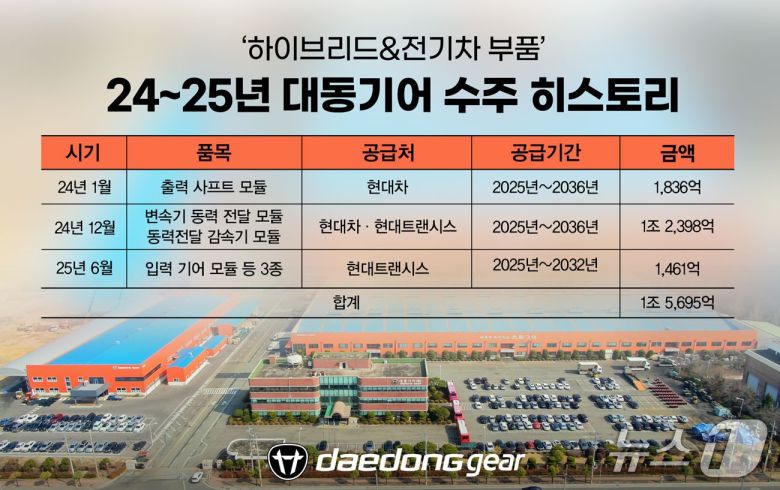 한편 대동기어는 지난해 총 1조 4234억 원 규모의 하이브리드 및 전기차 부품 공급 계약을 수주했다. 이번 계약을 포함한 수주 잔고는 약 1조 5695억 원 규모다.