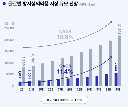 시장조사기관 얼라이드 마켓 리서치에 따르면 글로벌 방사성의약품 시장 규모는 2023년 79억6000만 달러에서 연평균 10.6% 성장해 2033년 218억2100만 달러에 달할 것으로 전망된다. 방사성의약품 시장은 진단제와 치료제 시장으로 나뉜다. 이중 진단제 시장은 2023년 기준 69.5%를 차지하고 있고, 치료제 시장은 30.5%를 차지한다.