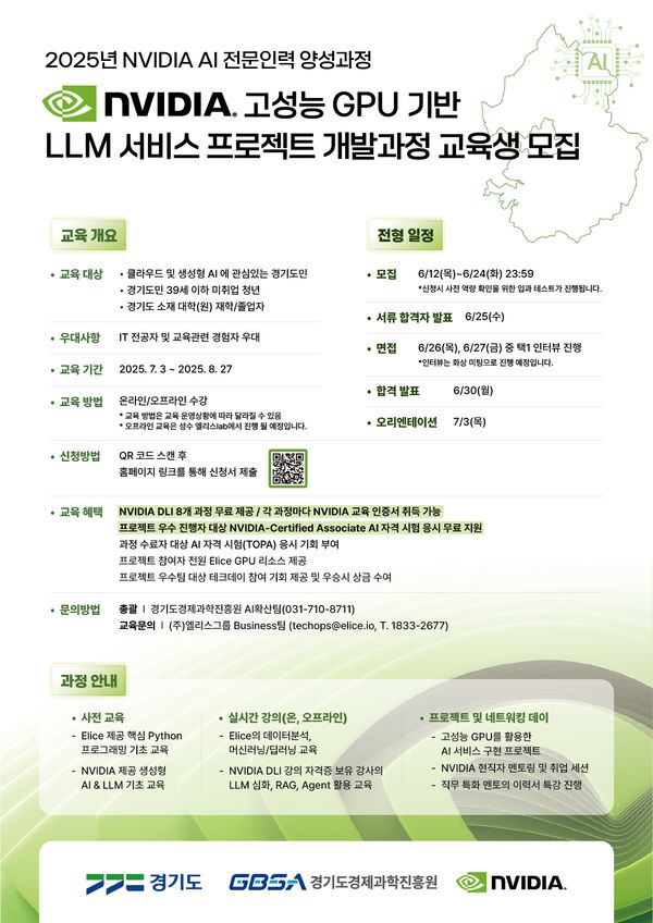 [필드뉴스=경기 강성원 기자] 경기도와 경기도경제과학진흥원(이하 경과원)이 글로벌 빅테크 기업인 엔비디아(NVIDIA)와 아마존웹서비스(AWS)와 함께 인공지능(AI) 분야 실무형 인재를 양성하기 위한 교육생을 모집한다고 18일 밝혔다.