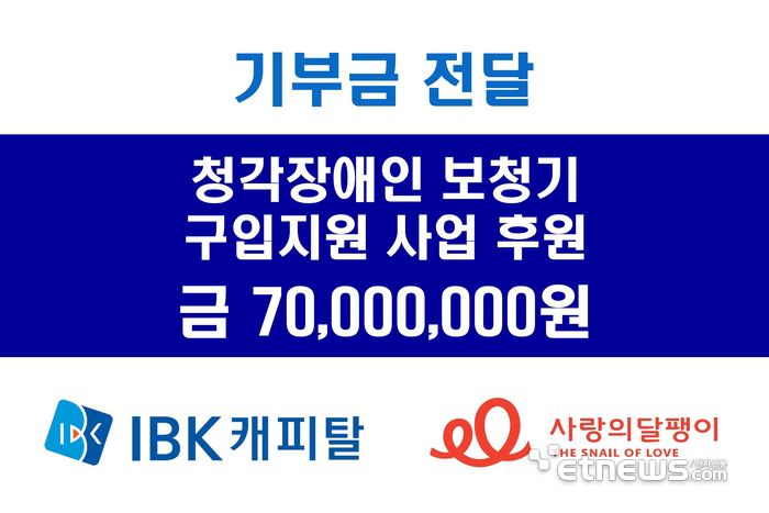 IBK캐피탈은 지난 16일 청각장애인을 돕는 사회 복지단체 사랑의달팽이에 저소득 난청 독거노인 어르신을 위한 보청기 구입 지원금 7000만원을 전달했다고 18일 밝혔다.