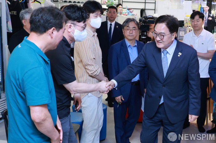 [서울=뉴스핌] 양윤모 기자 = 우원식 국회의장이 18일 오전 서울 노원구 홈플러스 중계점에서 홈플러스 입점점주협의회 회원들과 악수를 하고 있다. 이날 우 의장은 홈플러스 입점주들을 만나 애로 사항을 듣고 해결 방안 모색에 나섰다. 2025.06.18 yym58@newspim.com