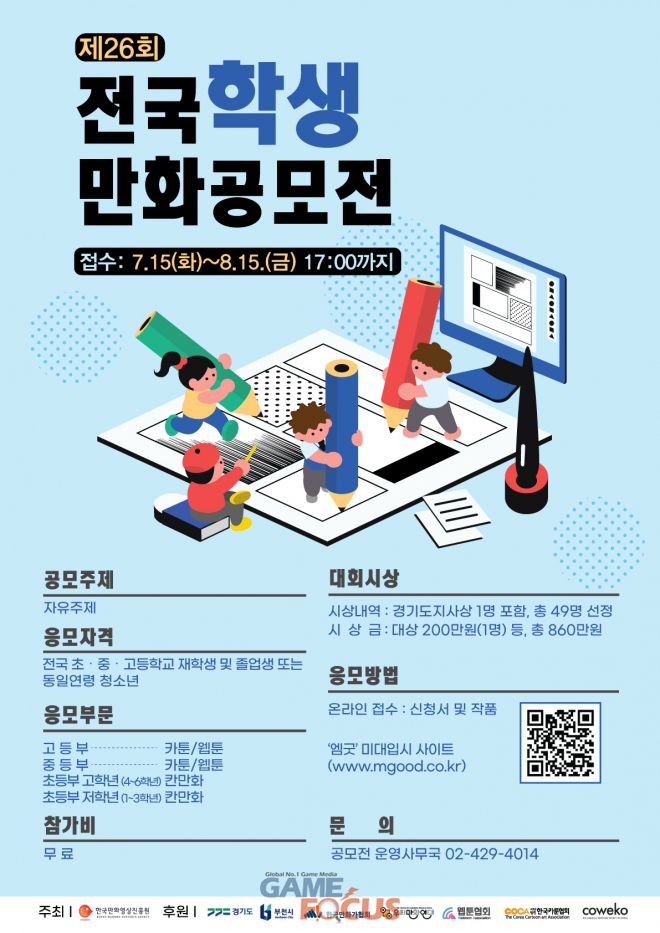 한국만화영상진흥원은 미래 만화 산업을 이끌어갈 창의적이고 재능 있는 인재를 발굴하고 육성하기 위해 ‘제26회 전국학생만화공모전’을 개최한다.