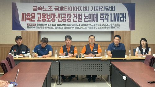 (광주=연합뉴스) 천정인 기자 = 전국금속노조 금호타이어지회는 18일 금호타이어 광주공장에서 기자간담회를 열고 "사측은 고용보장과 신공장 건설 논의에 나서라"고 요구했다.