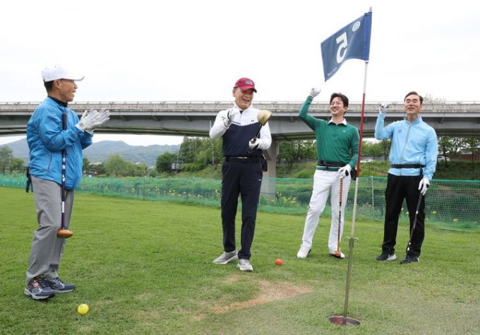 서울 강남구가 지난 5월 개최한 가족파크골프대회. (오른쪽부터) 경기에 참석한 허대무 강남체육회장, 정준호 강남구 홍보대사, 조성명 강남구청장, 강완식 강남파크골프협회장. /사진=뉴시스