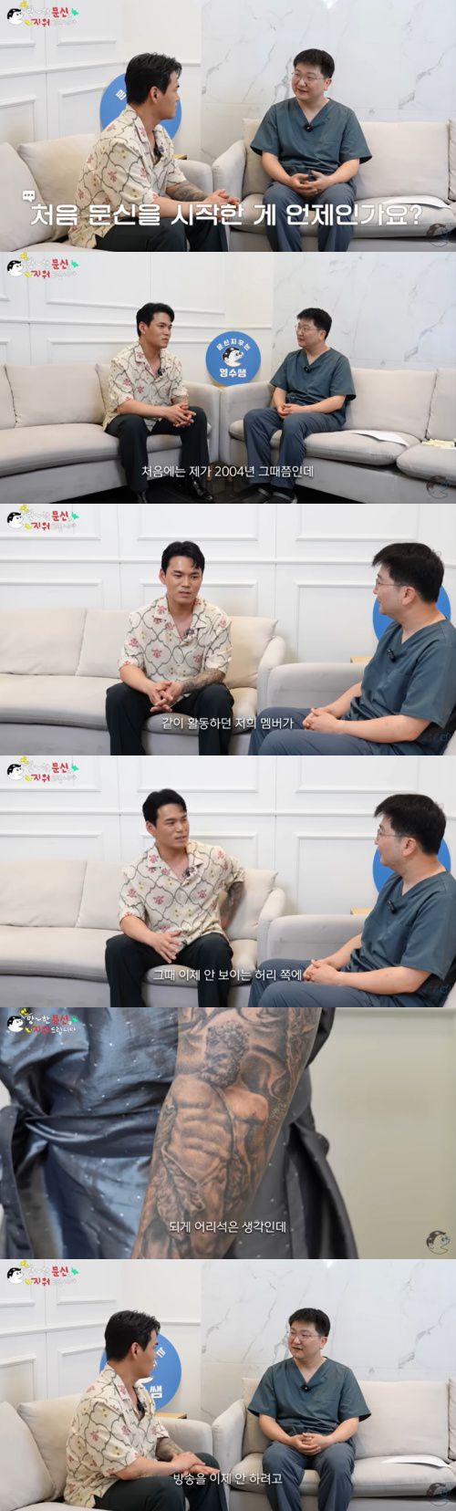 그는 "요즘 (트로트 가수 부캐) 천록담이라는 새로운 이름으로 다시 태어난 것처럼 살고 있는데, 안 좋은 생각을 많이 했을 때 문신들을 하기 시작했다. 내 몸에 남아 있는 이런 문신들을, 나쁜 생각들을 이제는 떨쳐보내고 싶다. 그래서 찾아오게 됐다"고 밝혔다.