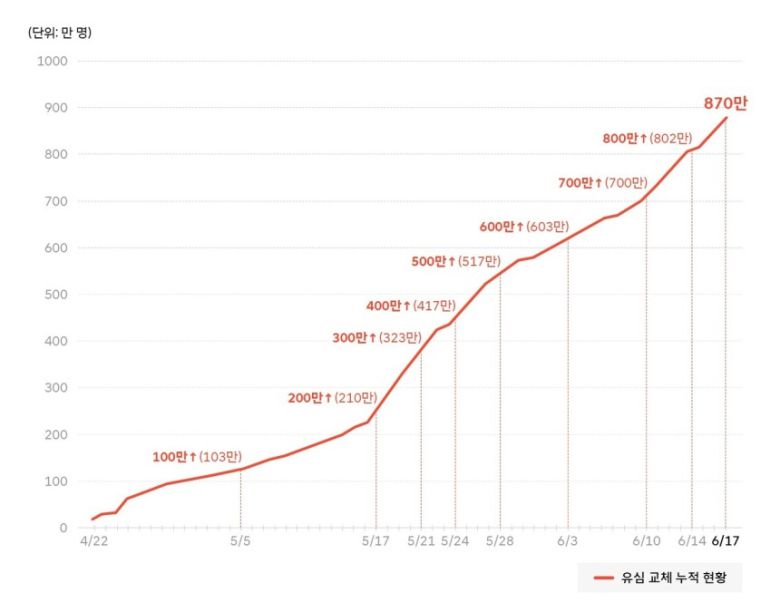 SK텔레콤의 유심(USIM) 교체 가입자가 누적 870만명을 기록하며 900만명을 목전에 두고 있다.