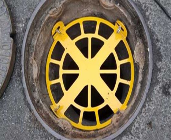 폭우로 뚜껑이 열린 맨홀에 행인이 추락하는 사고를 막기 위해 맨홀 추락방지시설이 설치된다.
