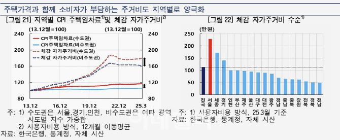 우선 지역간 주거비 격차가 확대됐다. 우리나라의 소비자물가지수상 주택임차료를 지역별로 살펴보면, 지난 3월 기준 지역별 체감 자가주거비 수준은 서울이 229만원인 반면 비수도권인 경북은 51만원, 전남은 49만원으로 편차가 컸다. 전국 평균은 113만원이다. 주거비를 포함한 물가상승률은 수도권과 비수도권간 격차가 주택가격 상승기인 2021년 12월에 최대 1.9%포인까지 확대됐다.