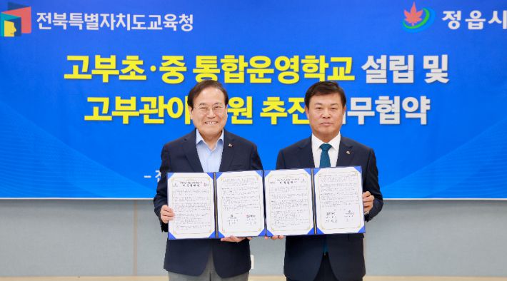 전북교육청과 정읍시는 이날 고부면 동학울림센터에서 고부초·중 통합운영학교 설립 및 고부관아 복원 추진을 위한 업무협약을 체결했다. 협약식에는 서거석 교육감과 이학수 시장을 비롯해 전북도의회 임승식·염영선 의원, 지역 주민 등이 참석했다.