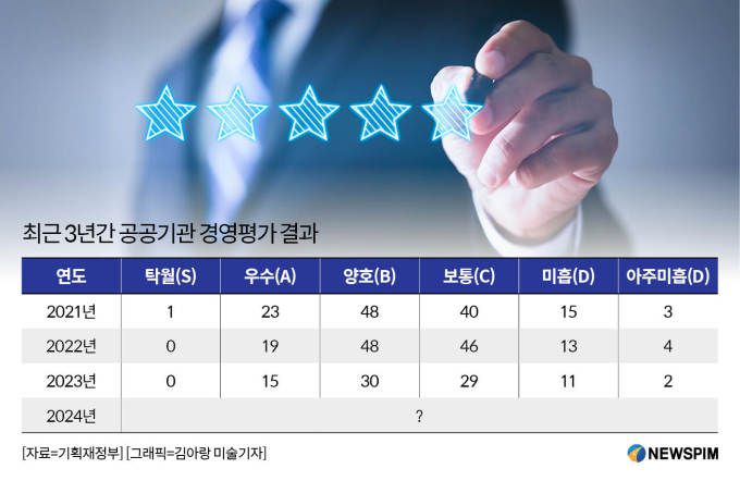 앞서 기재부는 지난 2월 7일 '경영평가단 워크숍'을 시작으로 본격적인 일정에 돌입했다. 교수·회계사 등 다양한 전문가 100명으로 구성된 평가단이 약 4개월 동안 서면·현장 실사를 진행해 점수를 산정했다. 지난해 평가는 공기업 32곳과 준정부기관 55곳 등 총 87개 기관이 대상이다.