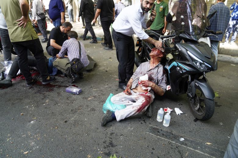 15일(현지시간) 이스라엘의 이란 공습으로 부상당한 시민들이 거리에서 구조를 받고 있다. AP연합뉴스
