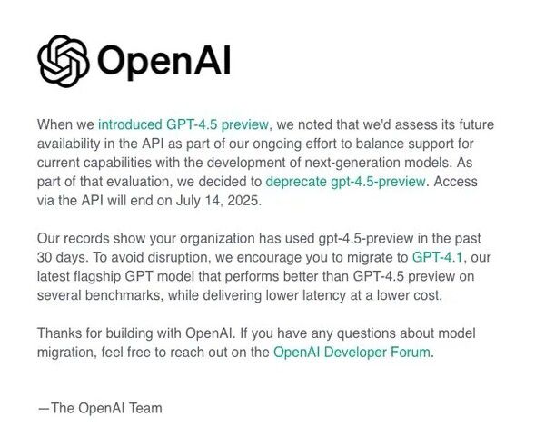 오픈AI가 7월 14일 GPT 4.5-프리뷰 API 지원을 종료한다. [사진: 오픈AI/벤처비트]