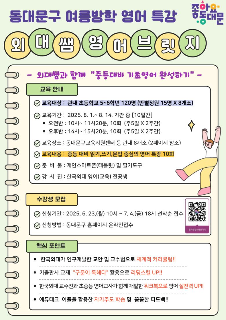 서울 동대문구가 중학교에 진학하는 관내 초등학생들을 대상으로 오는 8월 ‘외대쌤 영어브릿지’ 여름특강을 운영한다고 18일 밝혔다.