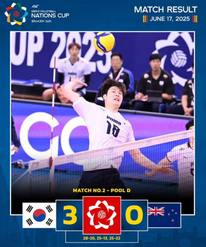 [서울=뉴스핌] 손지호 인턴기자 = 2025 아시아배구연맹(AVC) 네이션스컵 D조 1차전 한국과 뉴질랜드의 경기 결과. [사진=AVC 인스타그램] 2025.06.18 thswlgh50@newspim.com |