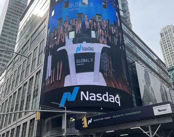 미국 뉴욕 타임스퀘어의 나스닥 마켓사이트(NASDAQ MarketSite)에 글로벌X 소개영상이 상영되고 있다. 사진 미래에셋운용 |