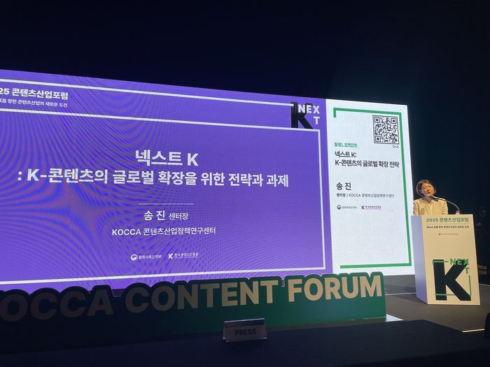 송진 한국콘텐츠진흥원 콘텐츠산업정책연구센터장은 18일 서울 광화문 CKL 스테이지에서 열린 '2025 콘텐츠산업 포럼'에서 “넥스트 K는 단순한 문화 트렌드가 아닌 전략산업”이라고 강조하며 K콘텐츠의 확장 조건으로 'H.I.P' 전략을 제시했다.