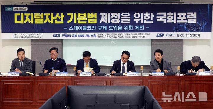 [서울=뉴시스] 조성봉 기자= 서병윤(왼쪽) DSRV 미래금융연구소 소장이 3월 5일 서울 여의도 국회 의원회관 간담회의실에서 열린 디지털자산 기본법 제정을 위한 국회포럼에서 발표를 하고 있다. 2025.03.05. suncho21@newsis.com |