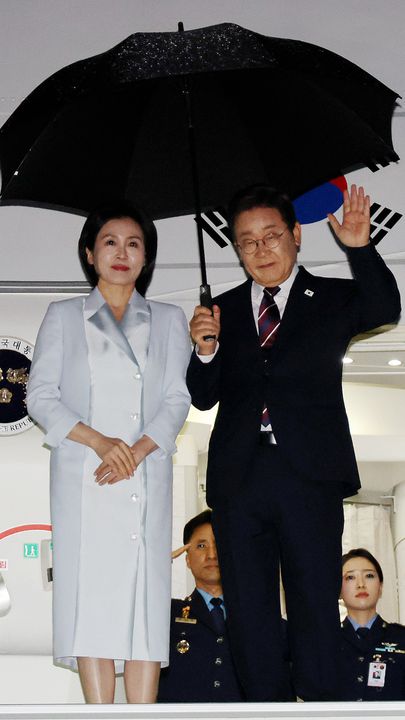이재명 대통령과 김혜경 여사가 17일(현지시간) 51차 주요 7개국(G7) 정상회의 일정을 마치고 캐나다 캘거리 국제공항에서 귀국하며 공군 1호기 올라 인사하고 있다. 연합뉴스 |