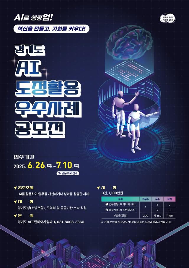 경기도는 생성형 AI를 포함한 인공지능 기술을 행정 전반에 창의적으로 접목한 사례를 발굴하고, 나아가 행정 혁신 문화를 확산하기 위해 ‘2025년 경기도 AI 도정활용 우수사례 공모전’을 개최한다.