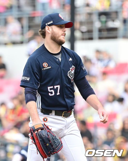 [OSEN=광주, 김성락 기자] 17일 오후 광주 북구 기아챔피언스필드에서 ‘2025 신한 SOL Bank KBO리그’ KIA 타이거즈와 두산 베어스의 더블헤더 1차전 경기가 열렸다.더블헤더 1차전 홈팀 KIA는 네일, 원정팀 두산은 콜어빈을 선발로 내세웠다.5회말 2사 2, 3루 두산 콜어빈이 KIA 이우성을 삼진아웃 처리한 뒤 기뻐하고 이싸. 2025.05.17 / ksl0919@osen.co.kr |