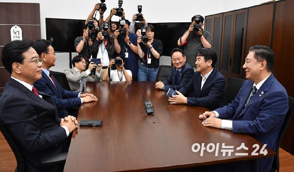 국민의힘에선 이날 유상범 의원이 신임 원내수석부대표로 내정돼 회동에 배석했다. 유 수석부대표는 "오늘 임명되고 나서 민주당 원내대표단과 상견례하는 자리였다"며 "내일 본회의 개최에 대해 여러 이견이 있어, 추후 논의를 진행하는 것으로 양당 간 협의했다"고 말했다.