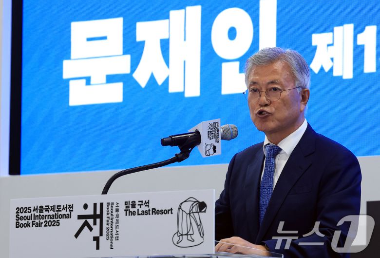 (서울=뉴스1) 박정호 기자 = 문재인 전 대통령이 18일 오후 서울 강남구 삼성동 코엑스에서 열린 2025 서울국제도서전 한국에서 가장 좋은 책 시상식에서 축사를 하고 있다. 2025.6.18/뉴스1