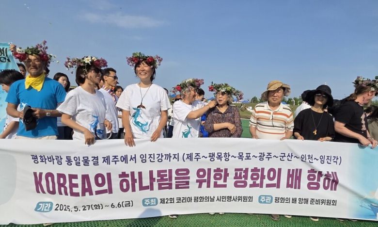 평화의 배 ‘요나스웨일’호를 타고 지난달 27일 제주 강정에서 출발하여 지난 6일 현충일 임진나루에 도착한 평화운동가들을 ‘코리아 평화의 날 파주’ 시민들이 임진각에서 맞아 머리에 화관을 만들어 씌워주며 환영했다. 맨 왼쪽이 송강호 평화의 배 단장. 원혜덕 제공 |