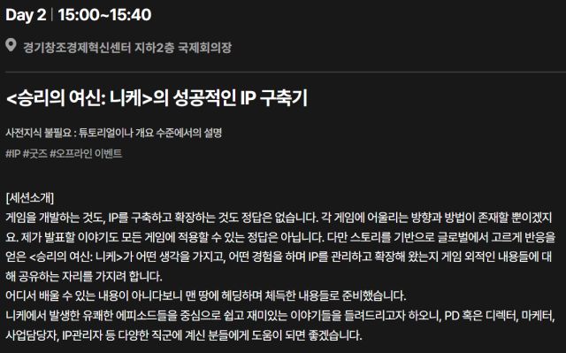 둘째날에는 업계 베테랑들의 강연이 열린다. 특히 '승리의여신: 니케' 개발자로 유명한 유형석 시프트업 총괄 디렉터가 강연에 나선다. 그는 '승리의여신: 니케의 성공적인 IP 구축기'를 주제로 스토리를 중심에 둔 IP 구축과 확장 과정에서 겪은 시행착오와 인사이트를 공유한다. 유 디렉터의 실제 경험을 바탕으로 '니케'의 전략과 방향성이 소개된다는 점에서 많은 이용자들의 관심이 쏠릴 것으로 예상된다.