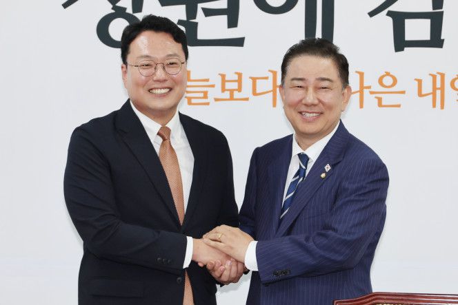 더불어민주당 김병기 당대표 직무대행 겸 원내대표(오른쪽)가 18일 서울 여의도 국회에서 개혁신당을 예방해 천하람 원내대표와 악수하고 있다. 2025.6.18.