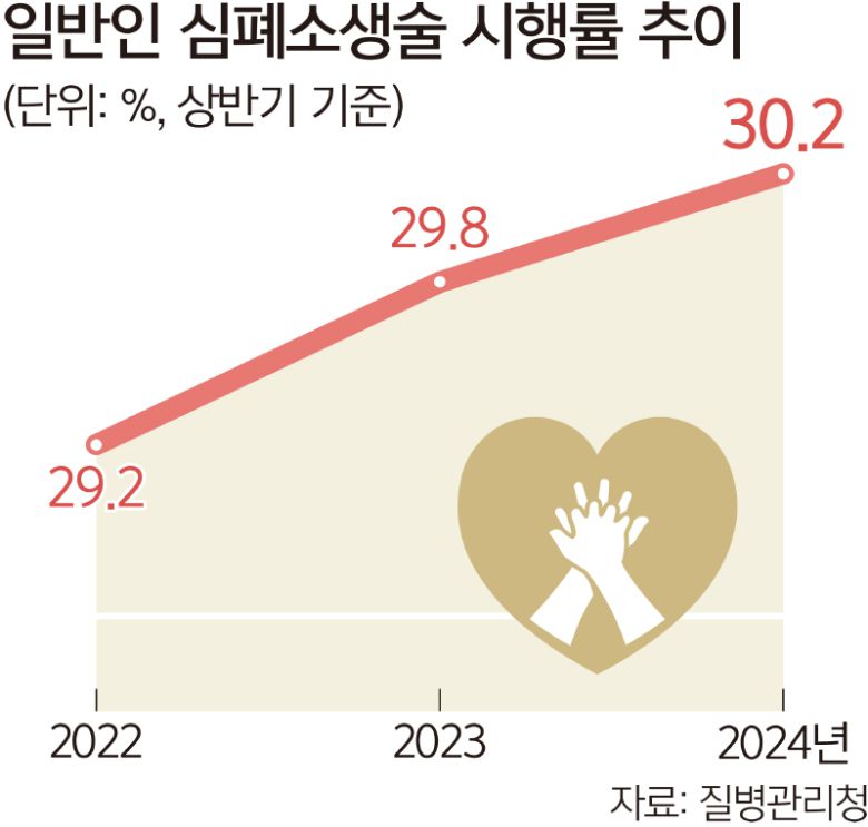일반인들이 심폐소생술을 하는 비율이 지난해 처음으로 30%에 진입한 것으로 나타났다. 이렇게 구급대원이나 의료인이 조치하기 전에 일반인이 현장에서 곧장 심폐소생술을 한 경우 심정지 환자 생존율은 그렇지 않은 경우의 2.2배에 달했다.