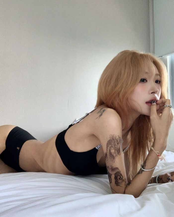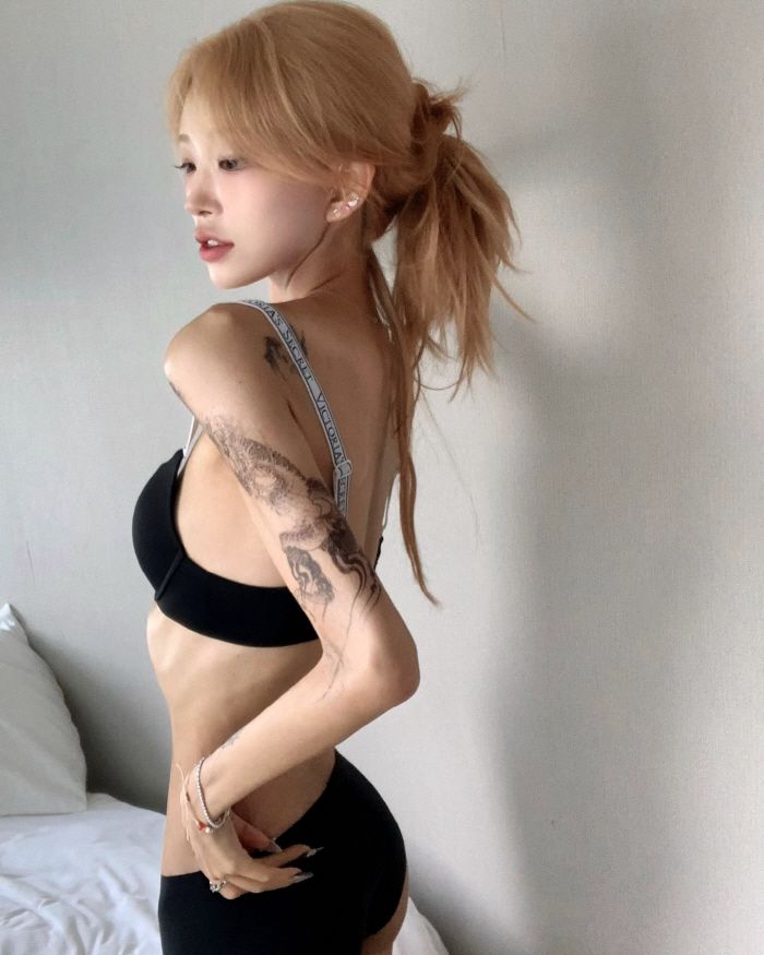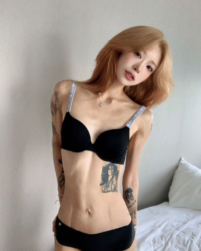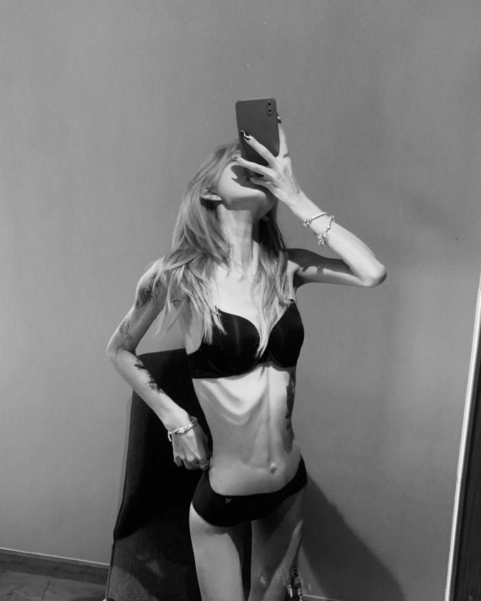 사진 속 최준희는 블랙 언더웨어 세트만 입고 몸매를 자랑했다. 특히 갈비뼈가 그대로 드러난 정도로 '뼈말라' 몸매로 시선을 사로잡았다.