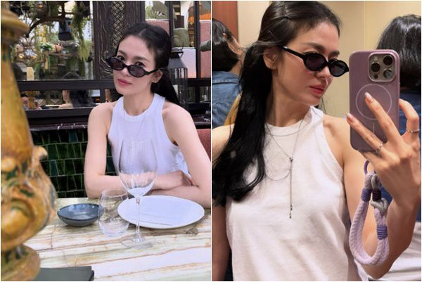 최근 송혜교는 자신의 SNS를 통해 근황이 담긴 사진을 게재했다. 사진 속 그는 검정색 슬랙스에 흰 민소매 톱을 매치한 심플하면서도 세련된 스타일로, 편안한 분위기를 자아냈다. 여기에 선글라스를 살짝 내리고 지은 사랑스러운 미소는 특유의 청순미를 더했다.