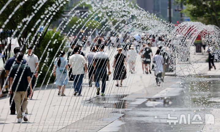 [서울=뉴시스] 배훈식 기자 = 서울 낮 최고기온 31도 등 전국이 30도 안팎의 무더운 날씨를 보인 18일 오후 서울 종로구 광화문광장에서 더위를 식혀주는 바닥분수 물줄기 사이로 시민들이 발걸음을 옮기고 있다. 2025.06.18. dahora83@newsis.com |