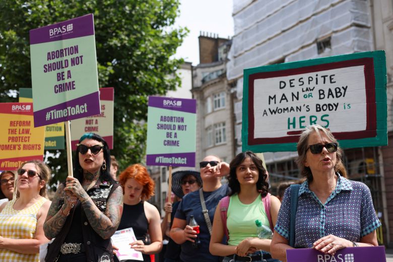 Campaigners participate in a demonstration in support and solidarity of decriminalising abortion in the UK, outside the Royal Courts of Justice, in London, Britain June 17, 2023. REUTERS/Susannah Ireland