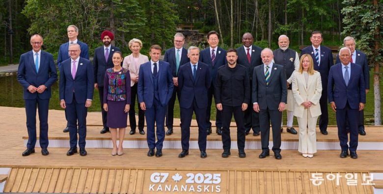 이재명 대통령(뒷줄 가운데)이 17일(현지 시간) 캐나다 앨버타주 캐내내스키스 주요 7개국(G7) 정상회의장에서 G7 및 초청국 정상들과 기념촬영을 하고 있다. 단체사진 뒷줄 왼쪽부터 시계 방향으로 스콧 베선트 미국 재무장관, 아제이 방가 세계은행 총재, 우르줄라 폰데어라이엔 유럽연합(EU) 집행위원장, 키어 스타머 영국 총리, 이 대통령, 시릴 라마포사 남아프리카공화국 대통령, 나렌드라 모디 인도 총리, 이시바 시게루 일본 총리, 안토니우 구테흐스 유엔 사무총장, 안토니우 코스타 유럽연합(EU) 정상회의 상임의장, 조르자 멜로니 이탈리아 총리, 루이스 이나시우 룰라 다 시우바 브라질 대통령, 볼로디미르 젤렌스키 우크라이나 대통령, 마크 카니 캐나다 총리, 에마뉘엘 마크롱 프랑스 대통령, 클라우디아 셰인바움 멕시코 대통령, 앤서니 앨버니지 호주 총리, 프리드리히 메르츠 독일 총리. 캐내내스키스=송은석 기자 silverstone@donga.com