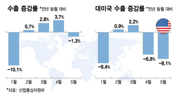 산업통상자원부가 6월 1일 발표한 5월 수출실적에 따르면 △철강(-12.4%) △자동차(-4.4%) △자동차 부품(-9.4%) △석유 제품(-20.9%) △석유화학(-20.8%) △일반 기계(-5.3%) 등이 마이너스 수출로 돌아섰다.