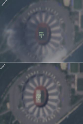 능라도 경기장에 나타난 대형 가림막 추정 물체(서울=연합뉴스) 이달 18일 센티넬-2 위성에 찍힌 평양 능라도 5월1일경기장의 모습(아래)과 이달 17일 사진(위). 18일 사진에는 17일에 없던 희끄무레한 물체가 경기장 필드를 덮고 있다. [유럽연합 코페르니쿠스 프로그램 제공. 재판매 및 DB 금지]