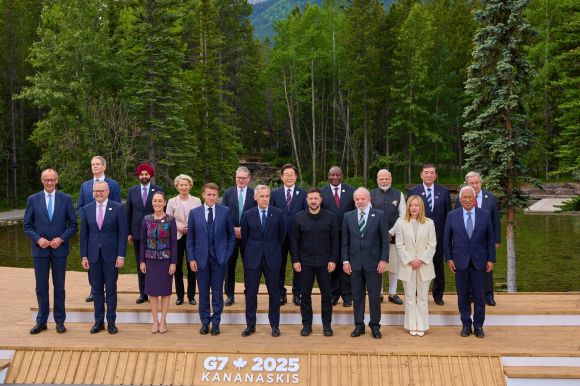 G7과 초청국 정상들 한자리에 - 이재명 대통령이 17일(현지시간) 캐나다 앨버타주 캐내내스키스 주요 7개국(G7) 정상회의장에서 G7 및 초청국 정상들과 기념 촬영을 하고 있다. 뒷줄 왼쪽부터 시계방향으로 스콧 베선트 미국 재무장관, 아제이 방가 세계은행 총재, 우르줄라 폰데어라이엔 유럽연합(EU) 집행위원장, 키어 스타머 영국 총리, 이 대통령, 시릴 라마포사 남아프리카공화국 대통령, 나렌드라 모디 인도 총리, 이시바 시게루 일본 총리, 안토니우 구테흐스 유엔 사무총장, 안토니우 코스타 유럽연합(EU) 정상회의 상임의장, 조르자 멜로니 이탈리아 총리, 루이스 이나시우 룰라 다시우바 브라질 대통령, 볼로디미르 젤렌스키 우크라이나 대통령, 마크 카니 캐나다 총리, 에마뉘엘 마크롱 프랑스 대통령, 클라우디아 셰인바움 멕시코 대통령, 앤서니 앨버니지 호주 총리, 프리드리히 메르츠 독일 총리. 캐내내스키스 연합뉴스 |