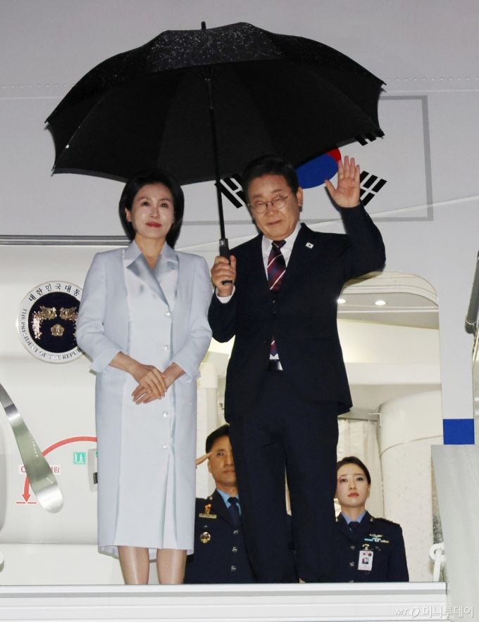 [캘거리=뉴시스] 최진석 기자 = 주요 7개국(G7) 정상회의 참석을 마친 이재명 대통령과 부인 김혜경 여사가 17일(현지 시간) 캐나다 앨버타주 캘거리국제공항에 도착해 공군 1호기에 탑승하며 손을 흔들고 있다. 2025.06.18. myjs@newsis.com /사진=