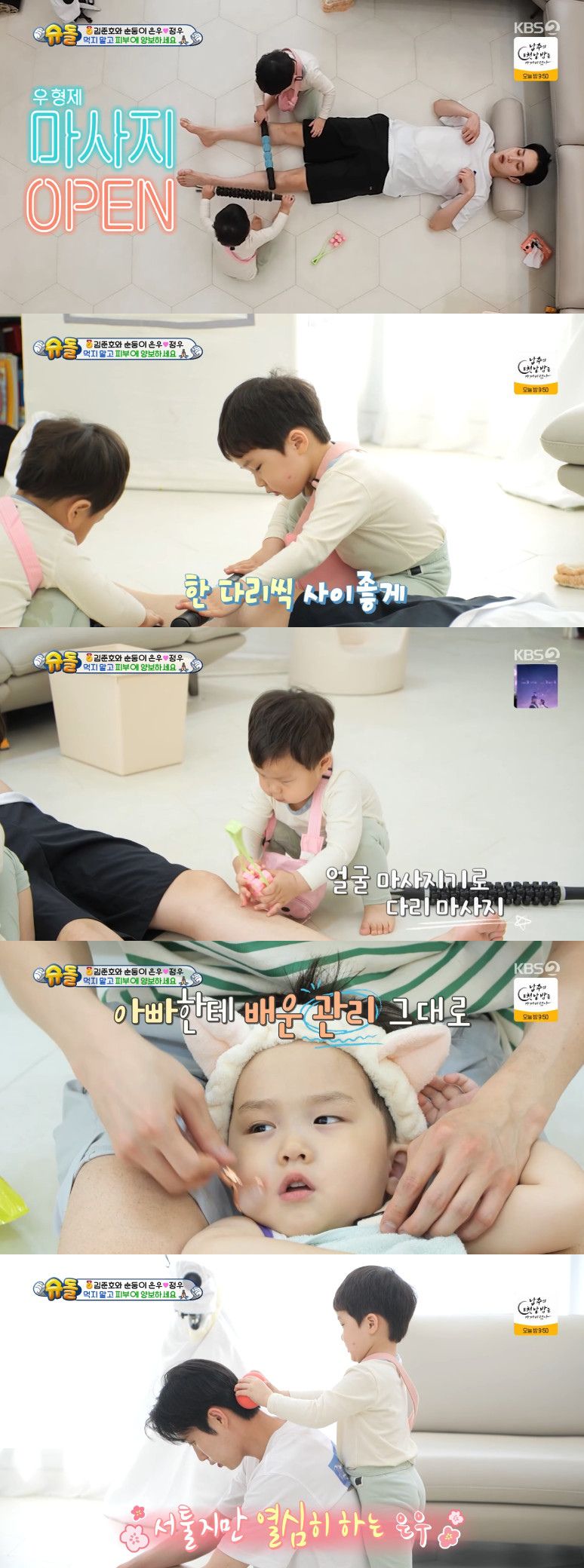 이후 김준호는 제작진에게 "마사지인지 같이 노는 건지. 마사지에 대한 의도를 잘 모르는 것 같긴 한데 저를 위해서 뭘 해주려는 거 자체가 귀여웠다"면서 두 아들을 향한 애정을 뽐냈다.