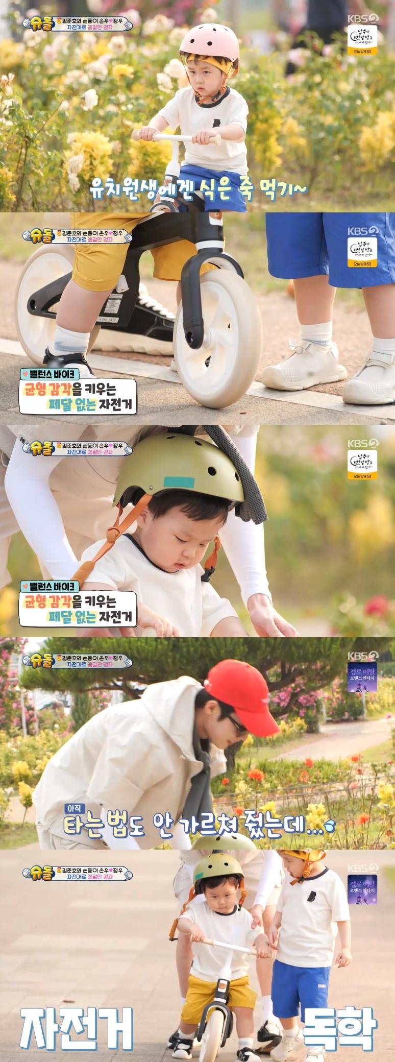 한강으로 향한 김준호는 은우가 균형 감각을 키우는 페달 없는 자전거인 밸런스 바이크를 타는 모습을 보고 "너무 잘 탄다"며 뿌듯해 했다.