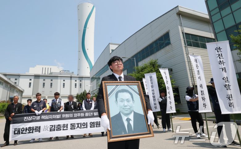 8일 오전 충남 태안 한국서부발전 태안발전본부에서 故 김충현 노동자 영결식이 거행된 가운데 운구행렬이 태안발전을 나서고 있다. 2025.6.18/뉴스1 ⓒ News1 김기태 기자