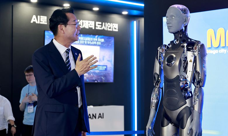 이날 개막식은 국내에 처음 공개되는 휴머노이드 AI 로봇 ‘아메카’가 사람처럼 표정 짓고 대화하며 관객과 교감하는 것으로 막을 올렸다. 영국 로봇 전문기업이 개발한 이 로봇은 다양한 언어를 구사하며 인간과 즉흥적 대화도 가능하다. 기조연설에 나선 로봇공학자 데니스 홍 UCLA교수는 “AI는 사이버 공간에 존재하지만 현실에서 작동하려면 물리적 구현체인 로봇이 필요하다”며 “도시의 지능이 실제 작동하려면 AI와 로봇의 통합이 핵심”이라고 강조했다.
