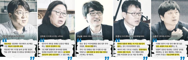 한겨레는 새 정부 출범을 맞아 5명의 언론계 전문가한테 미디어 분야 개혁 과제가 무엇인지 들어봤다. 공영방송의 정치적 독립성 확보를 위한 법·제도 개선과 ‘언론 장악’ 진상 규명, 낡은 미디어 거버넌스(지배구조) 개편, 언론·표현의 자유 보장 등이 우선순위로 꼽혔다.