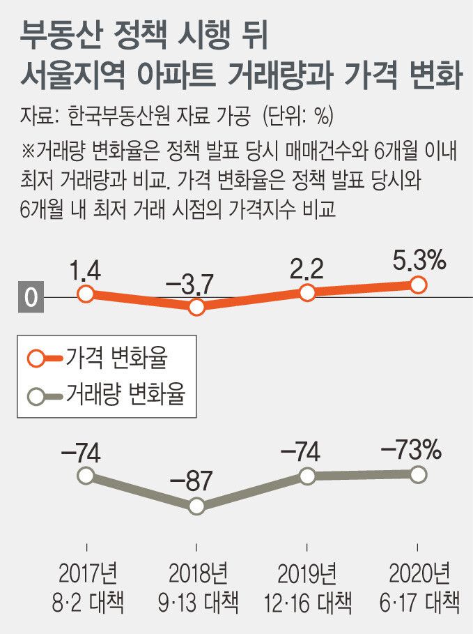 경제 이론상 이런 강력한 수요 억제책의 도입은 거래량 감소와 함께 가격 하락으로 이어져야 했다. 그러나 실제로는 거래량은 줄었음에도 가격은 오히려 급등하는 기현상이 일어났다. 정책 발표 후 거래량은 4분의 1토막 났는데 되려 가격은 5%나 오른 적도 있었다. 효과의 지속성도 문제였다. 초기에는 가격 안정화 효과가 있는 듯했지만 시간이 지날수록 강도가 약화되었다. 예컨대 집권 3년차인 2020년 발표했던 6·17 대책 이후 거래량 감소폭은 그 이전 정책발표 직후 상황과 유사했으나 가격 상승률은 그 이전보다 높았다. 시장이 규제 회피 방안을 학습하면서 내성을 갖게 된 결과다.