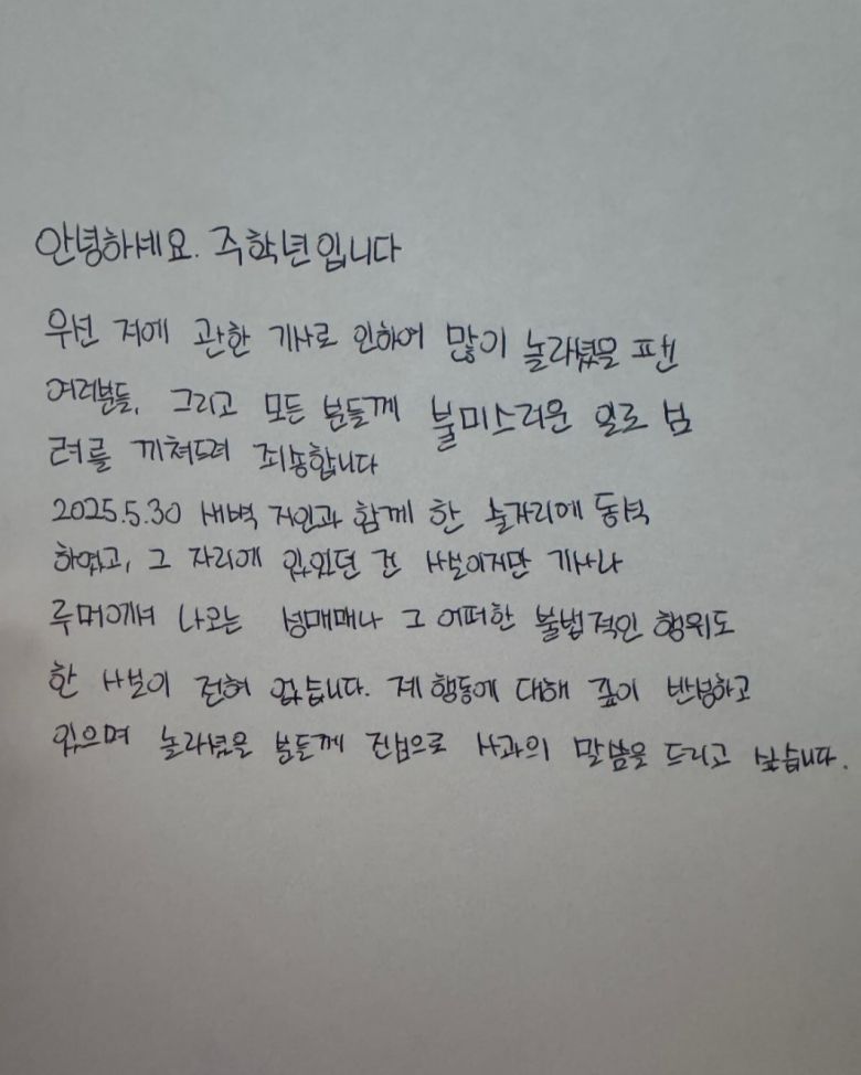 (엑스포츠뉴스 김수아 기자) 사생활 논란으로 소속 그룹을 탈퇴한 주학년이 뒤늦게 자필 사과문을 게재했다.