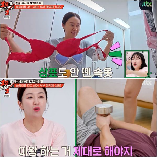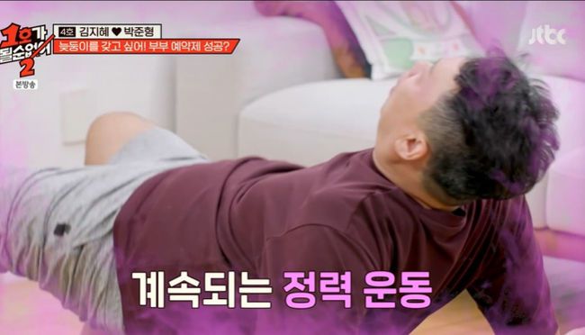 이후 박준형은 ‘정력 운동’이라며 본격적인 퍼포먼스를 시작했다. 그는 배꼽 주위에 아령을 올린 동작까지 선보이는가 하면 “어깨만 딱딱하겠냐”는 도발 멘트를 날렸고, 이에 김지혜는 “이번 생은 끝났다고 생각했는데, 기대해도 되냐”며 분위기를 끌어올렸다.