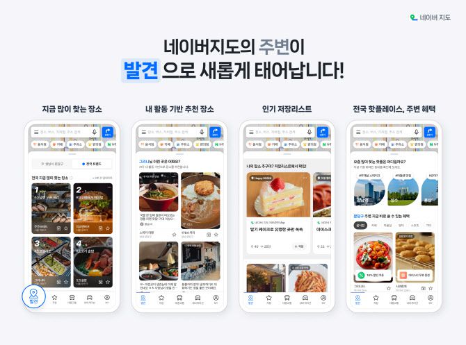 네이버는 지도앱 하단 좌측 첫 번째 탭에 ‘발견’ 메뉴를 새롭게 배치했다. 이 탭에서는 ▲현재 인기 장소 ▲내 활동 기반 추천 ▲화제의 저장리스트 ▲주변 할인 혜택 ▲지역별 핫플레이스 등 다양한 분류로 장소를 소개한다.