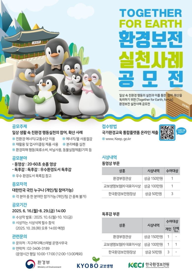 총 시상 규모는 900만원이며, ▷환경부 장관상(150만원) ▷교보생명 대표이사상(100만원) ▷한국환경보전원장상(50만원) 등 총 11점의 수상작이 선정된다.